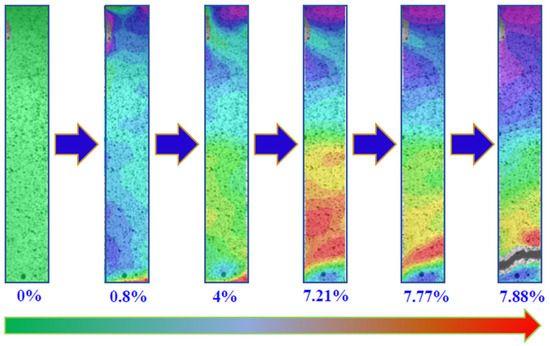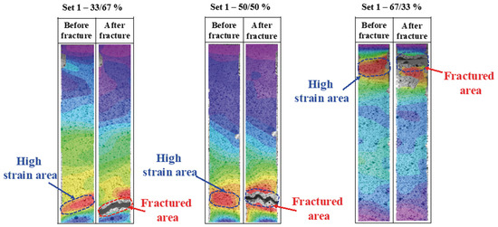 The application of 3D-DIC enabled an imagining of the full-field strain distributions and fracture mechanisms in samples under tensile loading. Figure 10 and Figure 11 illustrate strain maps during stages of loading, showing how strain localisation and crack propagation vary with changes in material ratios and layer configurations.