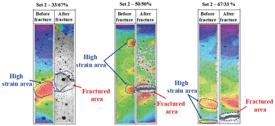 In set 1 samples, a clear dependency of strain localisation and fracture initiation site on the vPLA/rPLA ratio was observed. Specifically, samples with higher recycled material content (33:67 and 50:50 ratios) exhibited early strain concentration at the bottom region, evolving into complex, non-linear crack propagation paths. This irregular fracture behaviour can be attributed to the heterogeneous microstructure and differing mechanical properties between the vPLA and rPLA layers, a trend that has been similarly observed in rPLA, where void formation and interlayer heterogeneity were found to reduce overall mechanical performance [1].