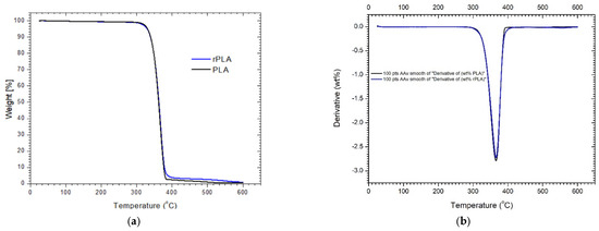 - TGA showed that both vPLA and rPLA begin to lose 5% of their mass near 330 °C; however, rPLA demonstrated a superior end-of-degradation temperature (461.7 °C) and a higher residue at 600 °C (0.99 wt% vs. 0.58 wt%), suggesting enhanced stability at elevated temperatures.