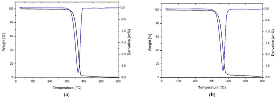 For TGA, samples of approximately 10 mg were placed in a 100 µL aluminium pan and heated from ambient temperature to 600 °C at a constant rate of 10 °C/min under a continuous flow of nitrogen to prevent oxidation. This protocol allowed for the measurement of key thermal parameters, including the onset of degradation (5 wt% loss), 50 wt% mass loss, the end-of-degradation temperature, the maximum rate of decomposition, and the residue at 600 °C. Table 7 summarises the TGA conditions.