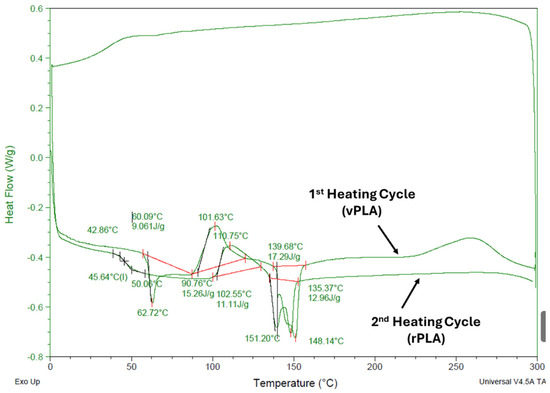 Thermal analyses show that both vPLA and rPLA begin to degrade at 330 °C; however, rPLA attains a higher end-of-degradation temperature (461.7 °C) and exhibits a higher residual mass at 600 °C. These findings suggest that despite rPLA’s generally lower tensile strength, its enhanced crystallinity results in superior thermal stability, a factor that can extend the operational range of the printed parts. The combination of these thermal benefits with improved mechanical performance highlights the potential of multi-material FDM to overcome the limitations typically associated with recycled polymers.