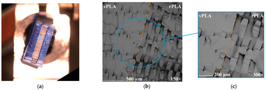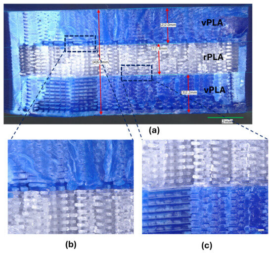Closer inspection of the material interface in Figure 16b,c shows a rough interface that, while indicative of some degree of adhesion, also highlights potential weaknesses in bonding. Observation shows the presence of voids and cavities along the interlayer boundaries, likely resulting from incomplete fusion or air entrapment during printing. These potential defects vary in size and distribution and are recognised in the literature as contributors to reduced mechanical performance and an increased likelihood of brittle fracture, particularly in configurations where rPLA is susceptible to chain scission and modified crystallinity [30].