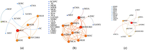 Chinese center government’s NDEM cooperation network, 1954–2022. (a) 1954–2007, (b) 2008–2015, and (c) 2016–2022. The larger the circle, the more times the corresponding organization appears. Abbreviations: SERC—State Electricity Regulatory Commission; MOF—Ministry of Finance; MCA—Ministry of Civil Affairs; MST—Ministry of Science and Technology; MOE—Ministry of Education; MOT—Ministry of Transport; AQSIQ—Administration of Quality Supervision, Inspection and Quarantine; SCNPC—Standing Committee of the National People’s Congress; SAWS—State Administration for Work Safety; CMA—China Meteorological Administration; MLR—Ministry of Land and Resources; SC—State Council; MOR—Ministry of Railways; NFCDRH—National Flood Control and Drought Relief Headquarters; MOA—Ministry of Agriculture; NSC—National Safety Commission; MOHURD—Ministry of Housing and Urban–Rural Development; NDRC—National Development and Reform Commission; MOC—Ministry of Construction; MCA—Ministry of Civil Affairs; NMPA—National Medical Products Administration; SCNPC—Standing Committee of the National People’s Congress; MOH—Ministry of Health; MWR—Ministry of Water Resources; SFPC—State Family Planning Commission; SOA—State Oceanic Administration; SFA—State Forestry Administration; LGPAD—Leading Group of Poverty Alleviation and Development; CEA—China Earthquake Administration; MEP—Ministry of Environmental Protection; SBSM—State Bureau of Surveying and Mapping; CBRC—China Banking and Insurance Regulatory Commission; EMO—Emergency Management Office of the State Council; MRA—Ministry of Rural Agriculture; PBC—People’s Bank of China; MEM—Ministry of Emergency Management; NEA—National Energy Administration; MNR—Ministry of Natural Resources; MCT—Ministry of Culture and Tourism; NRTA—National Radio and Television Administration; NFSR—National Food and Strategic Reserves Administration; MSA—Mine Safety Administration; NFGA—National Forestry and Grassland Administration; and NHC—National Health Commission.