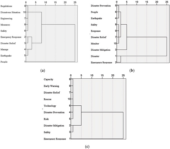 High-frequency policy terms during this period include “emergency response,” “disaster mitigation,” “safety,” “disaster prevention,” “technology,” and “disaster relief” (see Figure 4c). These terms cluster into three main themes: “emergency response,” “safety and disaster mitigation,” and “emergency response technology” (see Figure 5c). The central role of “emergency response” has been continually reinforced, creating a comprehensive “big emergency response” model. New terms such as “early warning” and “technology” have also emerged, indicating the critical role of science and technology in advancing China’s emergency management system and capabilities.