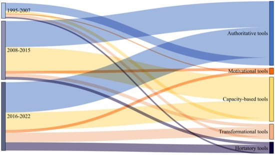 The use of policy tools across different stages is illustrated in Figure 6. While China’s NDEM policy tools encompass five types, their composition varies over time, with both the types and frequency of tools shifting at each stage. In terms of prevalence, authoritative tools consistently represent the highest proportion in all stages. Only in the second stage do capacity-based tools approach the frequency of authoritative tools. Motivational tools, in contrast, consistently represent the lowest proportion across all stages. This consistent pattern reflects the dominant role of hierarchical governance structures in China, where authoritative instruments remain the primary means of policy tools. Regarding orientations, the use of authoritative and motivational tools shows a gradual decline, while transformational and hortatory tools first decrease and then increase. The dominant reliance on authoritative tools is gradually weakening, indicating an increasingly optimized policy mix and a more diversified management approach.