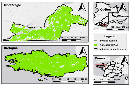 Figure 1 illustrates the geographical locations of the two study areas at a global scale, specifically detailing the Saint-Laurent Valley in Quebec and the Brittany region in France.