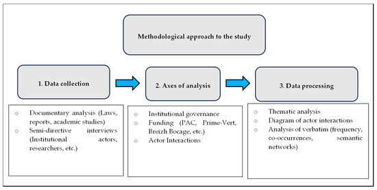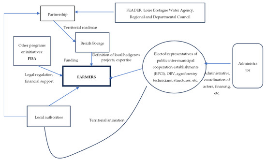 After examining the key actors involved in the development of agroforestry in Quebec, it is essential to turn to the case of France, with a particular focus on the Brittany region. At the national level, the Ministry of Agriculture, Food, and Fisheries (MAA) serves as the primary institutional pillar supporting agroforestry policy. Its role in advancing food sovereignty and addressing climate change has been formalized through the Agroecology Development Plan (PDA) and through direct support for agroforestry initiatives since 2015, with renewed momentum beginning in 2023 [10,30]. The French Environment and Energy Management Agency (ADEME), operating under the supervision of several ministries, also contributes significantly to the ecological transition through support for research and development projects such as CARBOCAGE, REACCTIF, and PARASOL. These national projects respectively address the development of local carbon markets, the enhancement of organic carbon stocks in agricultural soils, and tree-animal interactions in livestock systems [31,32]. ADEME further supports agroforestry by financing local initiatives through the Territorial Climate-Air-Energy Plan (PCAET) [33].