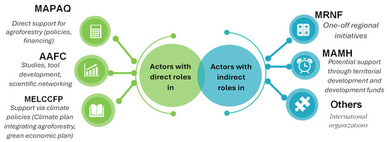 Overall, these institutions can be grouped into two categories based on their roles: (1) those with direct involvement in agroforestry through technical, financial, or strategic support (MAPAQ, AAFC, and MELCCFP); and (2) those contributing indirectly through complementary or regionally targeted actions (MRNF, MAMH, and some international organizations) (Figure 3).