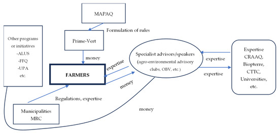 From a research and policy coordination perspective, the absence of a dedicated policy framework and the lack of formal recognition of agroforestry within broader agricultural programming limit synergies among stakeholders. The most recent revisions to the program (2017) did not reflect a renewed policy vision but instead introduced only marginal adjustments [18]. Moreover, many of the recommendations issued by the Agroforestry Committee of the Quebec Agriculture and Agri-Food Reference Center (CRAAQ) have been largely overlooked [18]. Finally, the weakening of technical training initiatives and the limited dissemination of agroforestry knowledge have further constrained the sector’s development and institutional consolidation. Figure 4 provides a visual summary of the governance structure of the Prime-Vert program and the key actors involved in its implementation.