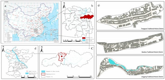 The climate characteristics, rich water resources, and urban–rural transition in Wangcheng District jointly create a unique natural and social environment for the formation and development of the traditional township blocks in this area. In particular, the water system and humid climate in the Xiangjiang River Basin have significantly impacted the spatial layout, architectural style, and functional organization of traditional blocks [39,40]. Therefore, this study selects three traditional blocks in Wangcheng District adjacent to the Xiangjiang River Basin, as research cases. These blocks are the Qiaokou, Tongguan, and Jinggang blocks. As a typical fishing port and water town, a Millennium Pottery City, and an important commercial port, respectively, the three reflect Wangcheng District’s core river-dependent nature. They have distinctive regional cultural characteristics and unique spatial layouts, reflecting the diversity of the history, culture, and functions of the traditional township blocks in the Wangcheng District. (Table 1). This study aims to investigate how various natural environments, historical backgrounds, and geographical factors interact to shape the rules and characteristics of spatial genetic diversity in traditional township blocks.