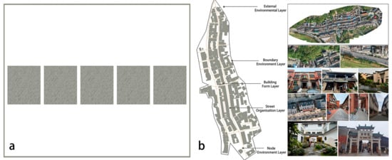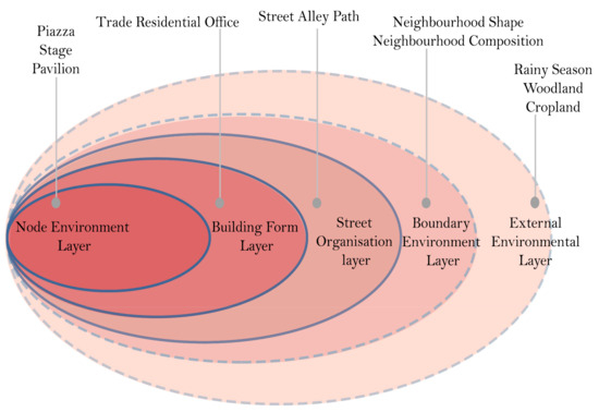Combined with the field survey results and referring to the hierarchical model of plant communities, this study divides the traditional township blocks in Changsha into five spatial levels: the external environment layer, the boundary environment layer, the architectural form layer, the street and lane organization layer, and the node environment layer (Figure 3) [44]. This division of these spatial levels is based on the blocks’ spatial function and layout and the historical and cultural characteristics of the block, aiming to comprehensively present the impact of the internal and external environment of the block on its spatial organization and structure. Specifically, the external environment layer focuses on the role of the natural environment and urban infrastructure surrounding the block; the boundary environment layer analyzes interfaces between the block and its environment; the architectural form layer focuses on the forms, structure, and spatial expression of buildings in the block; the organizational layer of streets and lanes emphasizes layout and functionality of lanes; and the node environment layer studies key nodes’ interactions with their surroundings.