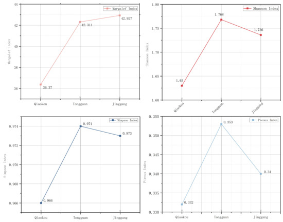 It can be seen from Table 6 that the Margalef indexes at the different levels of the three sample blocks are significantly different. The indexes of the building shape layer and node environment layer of each block are higher, while those of the external environment layer and boundary environment layer of the block are lower. Among them, Jinggang has the highest building shape index, followed by Tongguan and Qiaokou. In the node environment layer, the Jinggang Margalef index is the highest, followed by Tongguan, and Qiaokou is still the lowest. In contrast, the difference in the natural environment layer of each block is very small, but it is at the lowest level of all layers. These differences reflect the differences in the history, culture, and social functions of each block. Specifically, the Jinggang block has the highest Margalef index in the architectural form layer and node environment layer, which indicates that its architectural types, spatial forms, public spaces, and node structures are highly diverse. The Margalef index of the natural environment layer is the lowest, indicating that the landscape pattern and natural terrain of the traditional block are relatively stable, and follow the ecological concept of coexistence between man and nature. According to the field survey, the Jinggang block has the highest Margalef index in the architectural form layer and node environment layer. The reason for this is that, as the best preserved commercial water town in the Ming and Qing Dynasties in the suburbs of Changsha, its history of water transport and trade has promoted the development of wharves, shops, banks, and other characteristic spaces, and generated a unique Huxiang commercial port culture, resulting in a rich variety of architectural types and node space forms. The natural environment layer is generally the lowest, which is mainly because the natural landscape pattern is greatly constrained by nature and less manual intervention, forming a single gene model, and also shows that township’s residents advocate for the ecological concept of “following the trend” for the natural environment.