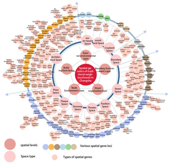 Against the background of the rapid development of information technology, the protection and renewal of traditional blocks need to rely on a digital platform to realize the visualization, retrievability, and dynamic update of spatial gene information [61]. It is suggested to take the block as the basic unit, integrate UAV aerial survey, remote sensing image, lidar 3D laser scanning, and other multi-source surveying and mapping technologies, and build a digital spatial gene map database integrating “geographic information–Architectural Structure–cultural semantics.” The database should cover the type attributes, functional evolution, historical age, and cultural value evaluation indicators of various gene loci, to realize the full life cycle management and real-time monitoring support of spatial genes. Based on the existing spatial gene recognition framework, this study systematically combed the multi-level spatial structure of traditional township blocks in Changsha, and constructed a spatial gene map including four levels of “node organization boundary external environment.” The atlas was developed as a central and radial structure, centered on the “core module of space gene,” and extends outwards to subsystems such as the architectural form, street network, boundary structure, and natural environment, and refines various spatial units such as street and lane organization, node space, gatehouse theater, memorial archways and ancestral halls, fields, mountains and waters, etc. The atlas identifies different spatial types and functional roles through color coding to enhance the visual expression effect and information recognition efficiency. The construction of the map aims to integrate the complex spatial form, historical evolution, and cultural gene characteristics of traditional blocks in Changsha. Through field research, literature analysis, and data visualization, the abstract spatial structure is transformed into a knowledge map with clear logic, complete semantics, and intuitive expression. This method not only helps to scientifically identify and classify key spatial genes, but also provides basic data support for cultural heritage protection, urban planning decision-making, and sustainable development paths, and significantly improves the practicability and dissemination of research results.