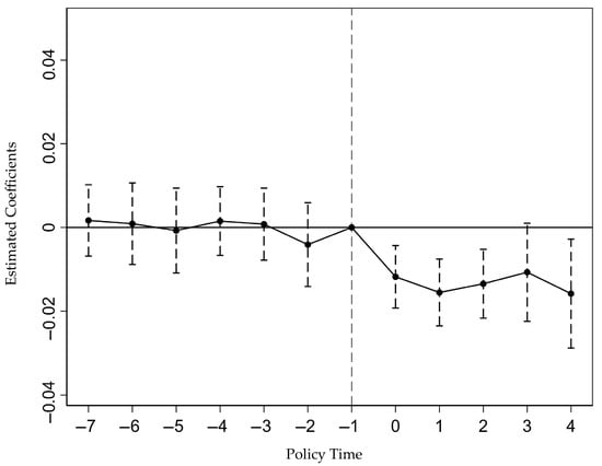 Finally, we conduct a parallel trends test, which is a key identification assumption in DID models. Using an event study approach, we examine whether the treatment and control groups followed similar trends in green innovation before the policy was implemented. Figure 1 plots the estimated coefficients and their 95% confidence intervals for each year relative to the policy implementation. The horizontal axis shows the years before and after the policy, and the vertical axis displays the estimated coefficients. The results indicate that most of the coefficients before the policy year (years −7 to −1) are statistically insignificant, and their confidence intervals include zero. This suggests no systematic differences in pre-treatment trends between the treatment and control groups, supporting the parallel trends assumption. After the policy implementation (year 0 and onwards), the coefficients show a general downward trend, with several years showing significant negative effects, further confirming the suppressive impact of the green finance pilot policy on urban green innovation.