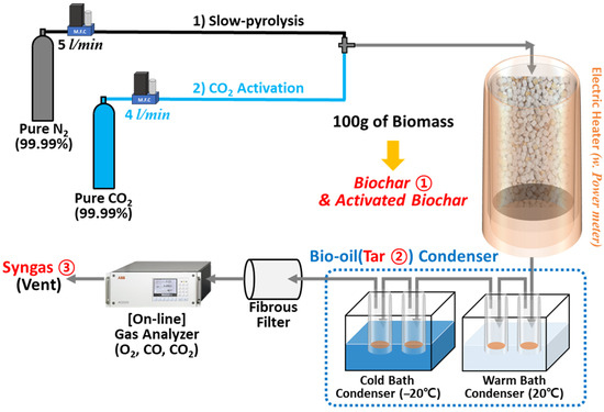 Figure 1 presents a schematic of the laboratory-scale fixed-bed pyrolysis system used for biochar production under various pyrolysis and activation conditions. The reactor, containing 100 g of cube-shaped biomass, had an inner diameter of 50 mm and height of 250 mm and was designed to maintain uniform temperature distribution. Pyrolysis was conducted by heating the reactor at a rate of 10 °C/min using external electric heaters until the target temperatures (500 °C, 600 °C, and 700 °C) were reached. These temperatures were maintained for 4 h to ensure complete pyrolysis. The selection of these temperatures was based on previous studies indicating that biochar produced within this range shows optimal pore structure and adsorption properties [26]. Electricity consumption during the heating process was measured using a power meter (Wattman HPM-100A, Noise Tech Co., Ltd. Seong-nam, Republic of Korea) for further use in the life cycle assessment. Nitrogen gas was supplied at a flow rate of 5 L/min (LPM) using a mass flow controller (VIC-D200; MFC KOREA, Incheon, Republic of Korea) to maintain an oxygen-free environment inside the reactor. For activation, pure CO2 gas was introduced at the same flow rate (5 LPM) after completion of the nitrogen-purged pyrolysis step. The activation process lasted for 3 h.