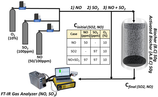 Figure 2 illustrates the experimental setup used to evaluate the adsorption performance of synthesized biochar. A total of 50 g of biochar was packed into an adsorption chamber, and a gas mixture containing either NO, SO2, or both (each diluted with 10% oxygen) was introduced. The initial concentrations of the gases are presented in Table of Figure 2. When the gas stream stabilized and passed the bypass line, the gas was directed through the biochar-filled chamber. Outlet concentrations of NO and SO2 were continuously monitored for 6 h using a Fourier-transform infrared (FT-IR) spectrometer (DX4000, Gasmet Technologies, Vantaa, Finland).