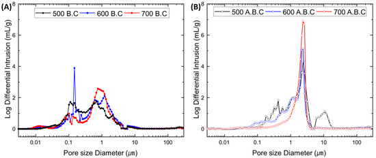 Pore volume distribution of biochar (B.C) (A) and activated biochar (A.B.C) (B) with different pyrolysis temperatures.