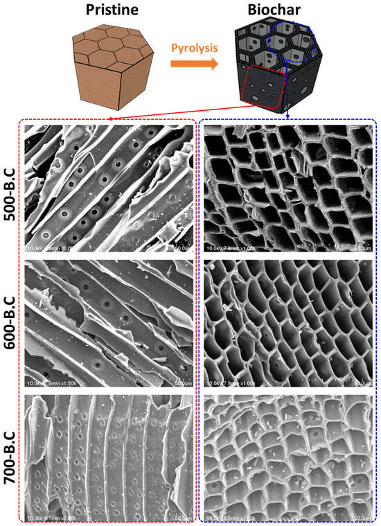 Graphical image of pristine biomass and pyrolyzed biochar with horizontal/vertical microstructures observed via field emission scanning electron microscopy (FE-SEM).