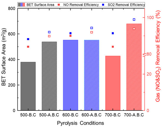 (Bar chart) Brunauer–Emmett–Teller (BET) specific surface area of biochar and (square plot) adsorption performance for individual gaseous air pollutants (NO and SO2) under different pyrolysis and activation conditions.