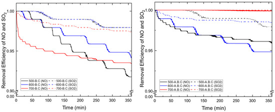 Figure 5 compares the adsorption efficiencies of NO and SO2 by biochar after 6 h under single-gas conditions. The detailed removal efficiencies of individual samples are provided in Figure A5. The biochar produced at 500 °C and 700 °C exhibited NO removal efficiencies close to 85%, while the biochar synthesized at 600 °C achieved approximately 90% efficiency. The NO adsorption performance was closely related to the presence of mesopores in the 2–50 nm range. Given that the kinetic diameter of NO is approximately 0.3 nm, biochar with a high proportion of mesopores in this size range offers more accessible active sites for gas adsorption [29]. Also, micropores (<2 nm) correlated with BET enhance both physical adsorption and surface-level chemical interactions, leading to improved overall NO capture.