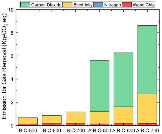 The CO2 emissions associated with the activation step increased further, with electricity-related emissions ranging from 1.07 to 2.52 kg CO2-equivalent depending on the activation temperature. Notably, the CO2 used for activation contributed more than half of the total GHG emissions in all activated biochar cases, reaching 4.39, 4.66, and 5.91 kg CO2-equivalent for activation at 500 °C, 600 °C, and 700 °C, respectively.