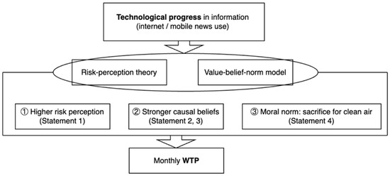 Figure 1 depicts the causal logic that guides our empirical tests. At the top, technological progress in information access—captured by residents’ reliance on internet or mobile-push news—constitutes the exogenous stimulus. Drawing on risk-perception theory and the value–belief–norm (VBN) model, we argue that this stimulus operates through two latent psychological blocks: heightened risk perception and an activated value–belief–norm chain. Concretely, digital media (i) make respondents more critical of past local air quality (Statement 1), (ii) strengthen their belief that energy use causes major ecological problems (Statements 2 and 3), and (iii) legitimize a moral norm that sacrificing private income for environmental protection is acceptable (Statement 4). These three micro-level cognitions form a sequential pathway that elevates the household’s monthly willingness to pay (WTP) for one additional “good-air” day, shown by the solid downward arrow. Accordingly, the framework generates two testable propositions: digital information raises WTP on average, and this effect is mediated by the three numbered cognitive shifts. Subsequent sections estimate the direct effect and probe the mediators.