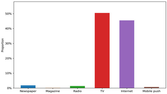 Figure 3 depicts the share of respondents who name each medium as their single most important source of news. Television dominates the landscape: just over half of all adults rely primarily on TV broadcasts. Online channels constitute the second-largest block—about 45 percent obtain most of their information from the internet, while another 1 percent use mobile push alerts. Together, these digital outlets account for roughly one resident in two, highlighting the rapid diffusion of new media by 2018. In contrast, traditional print and audio platforms play only a residual role: newspapers and radio are each chosen by little more than 2 percent of the sample, and magazines are virtually absent.