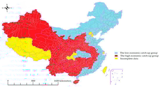 The high economic catch-up group includes 15 provinces: Shanxi, Anhui, Jiangxi, Henan, Hunan, Guizhou, Hainan, Sichuan, Yunnan, Shaanxi, Gansu, Qinghai, Ningxia, and Xinjiang. The low economic catch-up group comprises 11 provinces: Hebei, Inner Mongolia, Liaoning, Jilin, Heilongjiang, Jiangsu, Zhejiang, Fujian, Shandong, Hubei, and Guangdong. The distribution of each province is shown in Figure 1. Empirical results are presented in Table 5.