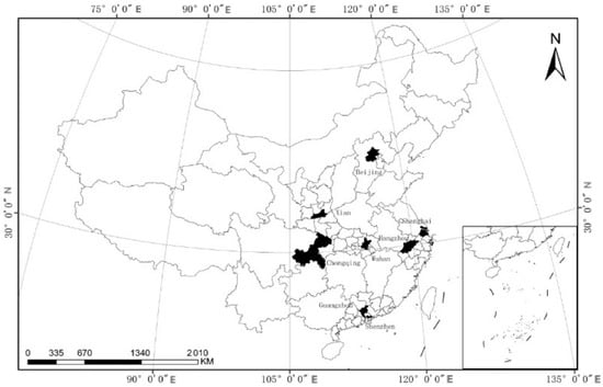 This study selected eight cities in China as the case study, including Beijing, Shanghai, Guangzhou, Shenzhen, Hangzhou, Wuhan, Chongqing, and Xi’an (see Figure 1). These cities were selected for their representativeness in economic performance, urbanization patterns, regional diversity, and development stages.