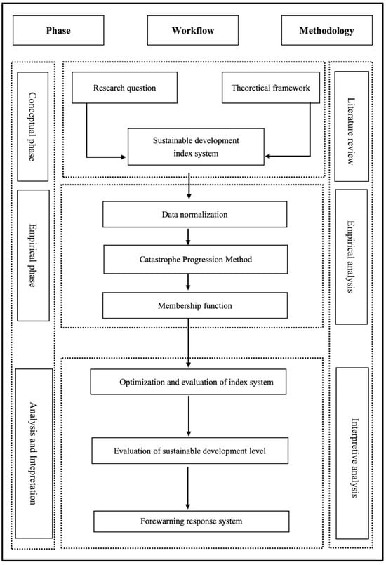 This article mainly utilizes the catastrophe progression method, collects data from Beijing, Shanghai, Guangzhou, Shenzhen, Hangzhou, Wuhan, Chongqing, and Xi’an for the period between 2012 and 2022, and establishes a comprehensive sustainable indicator system in China to answer two research questions. First, how effectively does the proposed four-dimensional sustainability assessment framework capture and quantify nonlinear performance dynamics in Chinese cities? Second, which critical sustainability thresholds identified by the four-dimensional assessment can inform early warning indicators and guide proactive policy interventions in Chinese urban governance? Figure 2 depicts the process flowchart to illustrate the overall research ideas and clarify its structure. The CPM integrates fuzzy mathematics to develop a catastrophe fuzzy membership function [,].