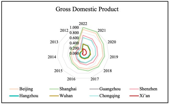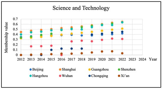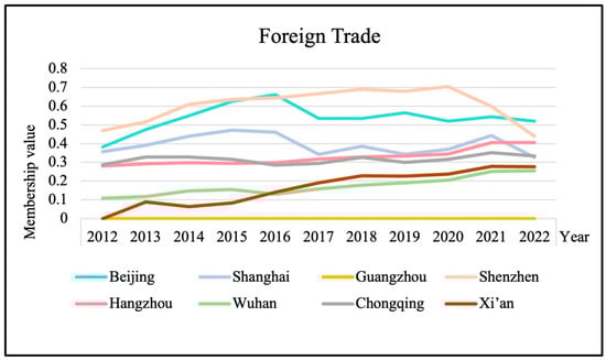 Economic Resilience and Innovation. Shenzhen and Hangzhou, with high economic membership values of 0.802 and 0.598, are driven by substantial R&D investment, advanced high-tech industries, the effective commercialization of research, and active foreign trade. Strengthening foreign trade by leveraging Special Economic Zones’ strategic advantages can enhance cooperation with international cities. Such efforts improve economic resilience [,] and advance China’s competitive position within the global industrial value chain.