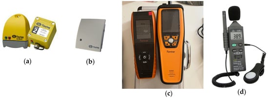 (a–d) Environmental monitoring and measuring equipment (Source: Authors’ own work). (a) Tinytag indoor & outdoor temperature and humidity data loggers (Manufacturer—Gemini Data Loggers (UK) Ltd., Hampshire, UK), sourced from RS Components Ltd. (Northamptonshire, UK). (b) Tinytag indoor CO2 data logger (Manufacturer—Gemini Data Loggers (UK) Ltd.), sourced from RS Components Ltd. (c) Temtop Air Quality Monitors (Manufacture—Temtop Inc., Shenzhen, China), sourced from Temtop. (d) Multi-Function 4-in-1 Environmental Meter, sourced RS Components Ltd.