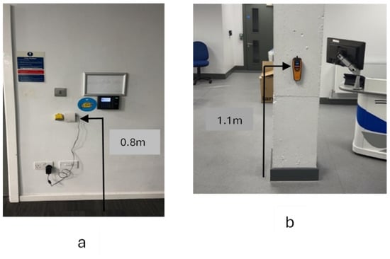 The environmental data monitoring was systematically conducted during the winter months, spanning from November to March. This period was strategically chosen because of the potential for significant variations in the indoor environment, which are primarily driven by the increased challenges associated with heating and maintaining comfortable indoor temperatures during colder weather. The monitoring equipment was programmed to record environmental data at five-minute intervals following the TM68 guidelines as well as drawing from methodologies adopted in similar studies. Furthermore, consistent with the TM68 recommendations, and to ensure an accurate representation of the occupants’ exposure, the equipment was strategically placed at heights of 0.8 and 1.1 m (illustrated in Figure 2a,b, respectively). These heights are considered to approximate the breathing zones of seated or standing individuals depending on the typical usage of each monitored space. This placement strategy was crucial for capturing data that truly reflects the environmental conditions experienced by building occupants, thereby providing a robust foundation for subsequent analyses of IEQ dynamics. Additionally, while ISO 7726 [31] recommends multi-point vertical averaging for detailed thermal comfort analyses, this study prioritized capturing occupant-relevant exposure in real-world HE spaces, where stratification effects were expected to be minimal due to standard room heights and mixing. Moreover, for parameters such as CO2, VOCs, and RH, vertical variation is negligible in occupied zones and a single-point reading within the breathing zone reliably reflects occupant exposure [32]. Therefore, the placement strategy used here reflects both methodological precedent and practical field constraints typical of POE studies.