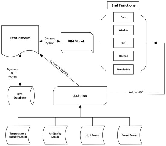 The framework of the BIM-based prototype, as illustrated in Figure 8, involves the synergy of functions or modules, including the integration of sensor systems, advanced data processing using Dynamo and Python within Autodesk Revit for the storage of IEQ data in the BIM model and the subsequent implementation of the IEQ data into the BIM model, and a responsive control system. Each component plays a vital role in the continuous cycle of data collection, analysis, and environment adjustment, thereby ensuring that the indoor conditions are consistently aligned with the recommended standards for the wellbeing and comfort of building occupants.