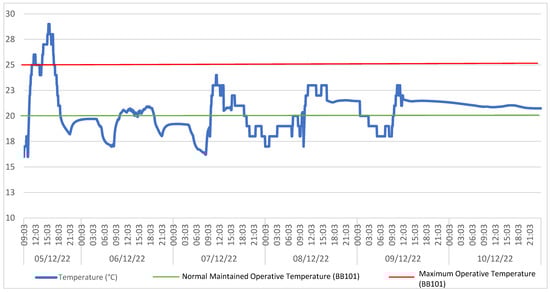The POE conducted across the two university campuses provided insightful data that highlighted the variability in IEQ conditions across different spaces. The mean evaluation of the environmental data recorded across the various rooms demonstrated compliance in most of the IEQ parameters as outlined in Table 2. To provide a clearer representation of the continuous monitoring process, Figure 4 presents the continuous temperature data recorded in the Architectural Studio, one of the naturally ventilated spaces included in the study. This chart illustrates typical diurnal fluctuations and responses to both external and internal conditions, capturing the room’s thermal behaviour over an extended period (5–10 December 2022). While only one room is shown in detail for practicality and clarity, this trend was generally consistent across the other naturally ventilated spaces in the study, with comparable profiles observed. The data presented in Figure 4 demonstrates clear fluctuations in indoor temperature across the monitored period, reflecting dynamic interactions between internal heat gains, external weather conditions, and the limited control afforded by natural ventilation. Peaks above 25 °C were observed particularly on 5 December, exceeding the BB101 upper threshold for teaching spaces, which observations showed coincided with sustained heating. Conversely, dips below 20 °C occurred during early morning and evening hours, indicating periods when heating was relatively inactive. The variability reinforces the susceptibility of naturally ventilated rooms like the Architectural Studio to environmental swings, particularly in winter.