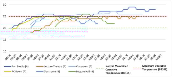To highlight specific instances of non-compliance and thermal stress, Figure 5 displays selected data representing the worst-performing temperature periods across each monitored room. These days were identified based on the frequency and magnitude of exceedances above the upper operative temperature limit of 25 °C, as defined by BB101. This standard was selected for its direct applicability to UK educational institutions and is consistent with local regulatory expectations. While European standards such as EN 16798-2 [35] provide valuable categorizations (e.g., Category I–III), BB101 offers space-specific guidance tailored to classroom settings in the UK, thereby serving as a more contextually relevant reference point for this research. Notably, spaces such as the PC Room (A) and Classroom (A), both naturally ventilated, recorded prolonged periods above this threshold. Observations indicated that the heating systems in these rooms were constantly on and while the windows were open occasionally, with the outdoor air temperature being between 3 and 8 °C, the natural ventilation system may not suffice for maintaining thermal comfort, particularly when the internal heat gains are factored. The excessive temperatures in naturally ventilated spaces such as these tend to compromise the learning environment, thereby causing discomfort to students [36,37,38].