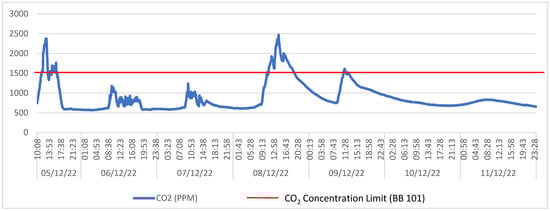 Similarly, the CO2 concentration levels were also continuously recorded across the selected spaces, with a particular focus on understanding how different ventilation strategies impacted indoor air quality. As with temperature, a continuous monitoring chart for CO2 concentration in the Architectural Studio is provided in Figure 6, which offers a broader perspective of IAQ variation over time. This room was selected as a representative example due to its combination of high occupancy, natural ventilation, and observed exceedances. The data shows that concentration peaks were consistently recorded during occupied periods, particularly on 5 and 8 December, with values surpassing the 1500 ppm threshold set by BB101. This underscores insufficient ventilation effectiveness under higher occupant loads. Nighttime readings dropped significantly, confirming reduced activity and natural dilution. The pattern of repeated exceedances during peak hours highlights a recurring IAQ issue in naturally ventilated learning spaces, reinforcing the need for improved ventilation strategies or supplemental mechanical systems to maintain CO2 levels within acceptable limits during teaching hours.