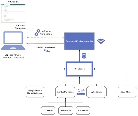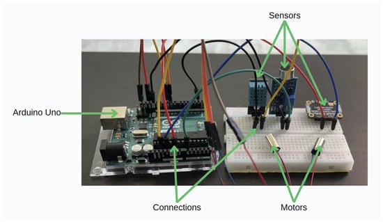 The other core part of the sensor system is the connection of the environmental sensors to an Arduino UNO microcontroller, as depicted in Figure 7 and Figure 8, which is a versatile open-source electronics platform that combines robust hardware with user-friendly software [49]. The sensors are connected to the Arduino UNO via a breadboard, which provides a convenient platform for constructing an electronic interface between the Arduino and the sensors as well as easy adjustments and additions of sensors as required. The system is also capable of incorporating wireless technology, which allows for more flexible sensor placement and real-time data transmission to the Arduino Uno. This feature reduces the clutter and limitations associated with wired connections, thereby making the installation and scalability of the sensor system more efficient.