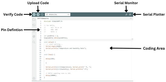 Once connected, the sensors are programmed for use via the Arduino Integrated Development Environment (IDE), which is an application that supports both the writing of new code and the uploading of it to the Arduino board. This process thereby allows for the programming of the Arduino device to manage the interaction between the microcontroller and the connected sensors. The IDE is hosted on a laptop, which also provides power to the Arduino, which allows for the creation of a compact and efficient workstation for sensor management. Once the environmental sensors are connected and the Arduino is programmed using the IDE, which is shown in Figure 11 with a sample DHT sensor, the system begins to monitor the IEQ parameters continuously. The data from the sensors is read by uploading the code into the IDE, which can then be viewed through the serial monitor or serial plotter options in the menu bar. This comprehensive integration of hardware and software enables the room sensor system to provide reliable and real-time data that is crucial for effective IEQ management in HE buildings.