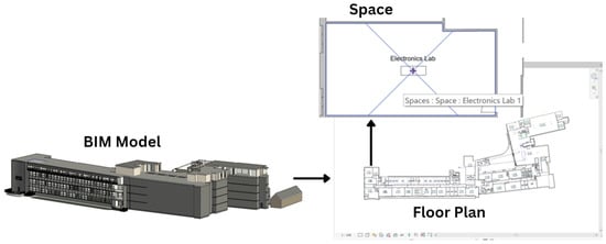 BIM model with embedded floor plan detailing specific spaces (Source: Authors’ own work).