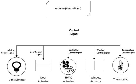 Beyond data visualization and analysis, the integration of sensor data into the BIM model via Dynamo also facilitates the automation of environmental adjustments, which represents the final function or module of the framework referred to as the control system. As illustrated in Figure 17, this system utilizes the real-time data integrated into the BIM to optimize the IEQ, thus guaranteeing that building operations are both efficient and responsive to the immediate needs of occupants. It is centralized around the Arduino microcontroller that functions as the control unit, managing various environmental control mechanisms based on the data processed and the commands generated. In this setup, Arduino, through the Arduino IDE, receives these data insights and based on predefined conditions, sends out control signals to various actuators that are responsible for adjusting environmental conditions. For instance, when the ventilation control signal is sent, the HVAC actuators are engaged to adjust the airflow, which allows for the optimization of the air quality and temperature. Expanding this capability, motor actuators are integrated to the prototype via Arduino, as shown in Figure 14, to physically enact these changes, such as opening windows or adjusting shades, thus mimicking real-world operations based on the automated decisions. These actuators transform electronic commands into mechanical actions, facilitating the adjustments made by the control system to have a direct and effective impact on the building’s environment.
