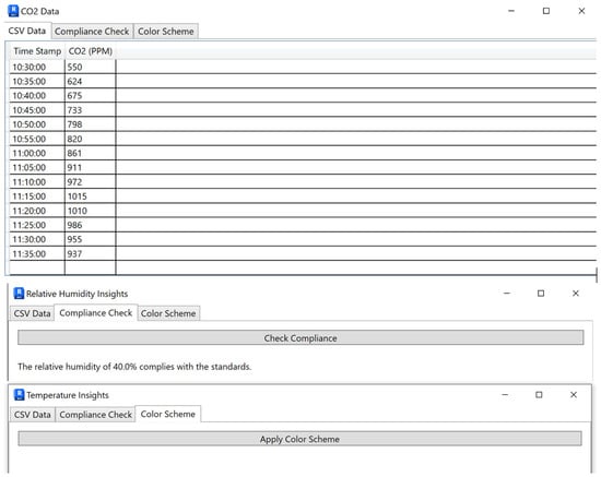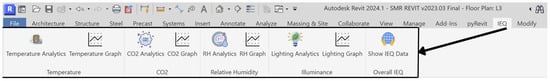 To further enhance the practical application of the BIM-based IEQ management prototype, a custom IEQ interface was developed within Revit using pyRevit and Python scripting. This custom interface, which is accessible under a dedicated “IEQ” tab, integrates multiple functionalities for visualizing, analyzing, and managing IEQ metrics such as temperature, CO2 levels, and relative humidity. The interface tab, as illustrated in Figure 18, enables users to dynamically monitor real-time data collected through the system and make informed decisions on environmental adjustments.