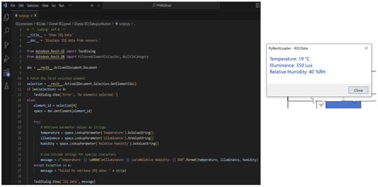 - User Interaction Module: This module enhances user engagement by providing an intuitive interface built using the pyRevit plugin, thereby allowing users to navigate through the IEQ data effortlessly. The system’s interaction functions ensure that users can easily access, interpret, and respond to the displayed environmental information, which enables proactive management of the IEQ within individual spaces.