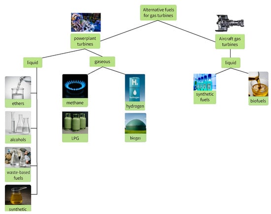 Gas turbines can run on either liquid or gaseous fuels, but only liquid fuels are appropriate for the aviation industry due to their storability. The main types of fuels used in gas turbine power plants are shown in the Figure 3: