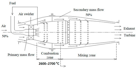 Flameless Oxidation (FLOXTM) is a self-ignition combustion technology. In FLOX or MILD combustion, flue gas (N2, CO2, H2O) is recirculated within the combustion chamber towards the flame front to reduce the O2 concentration in the oxidant and to heat the reactants above the auto-ignition temperature [25,26,27]. Another solution is to use multi-stage combustion chambers [28]. In these, the reaction zone is divided into two parts, a zone with a high equivalence ratio (first stage) and a zone where the equivalence ratio is lower (second stage). In the first stage, the average equivalence ratio is 1.4 where no NOx concentration is formed due to low temperature and oxygen concentration, and then in the second stage, a lean mixture is formed by adding secondary air where NOx formation can be kept low by controlling the air flow [29]. Nowadays, longitudinal axial flow combustion chambers are widespread in high power gas turbines [30,31,32,33]. Figure 7. shows a multistage combustion chamber design; such designs are used in Siemens, Ansaldo, and GE gas turbines.
