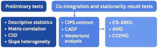 is the adjusted variance of the coefficient estimates in Equation (4). Similarly, the Adjusted Delta statistic follows a chi-square distribution with degrees of freedom. Meanwhile, the panel data’s stationarity was measured via the CIPS unit root test. The CIPS test is relevant for confirming that all the factors are integrated in the same order. Stationarity is a prerequisite for reliable econometric analysis [56]. The model for the CIPS unit root can be written as demonstrated in Equation (6), where is the variable of interest, and are parameters, is the coefficient of the lagged variable, and represent the coefficients of differenced terms, denotes the coefficient of the cross-sectional average, and is the error term. Furthermore, the CADF test accounts for cross-sectional dependence when unit roots are examined, providing a more robust check for stationarity [57]. CADF can be utilized with Equation (7), where is the lagged first difference of and where represents any additional covariates or regressors. signifies the autoregressive coefficient, and represents the coefficient for the lagged difference term. shows the coefficient for , and represents the residual term. The flow chart of the approaches applied in the current study is portrayed in Figure 1.