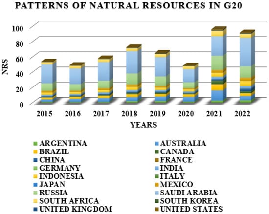 Moreover, the trends of natural resource rents (NRSs) in G20 countries from 2015 to 2022, illustrated in Figure 3, reveal notable fluctuations that align with both resource endowments and national economic strategies. Countries such as Australia, Brazil, and Saudi Arabia exhibit a sustained increase in NRS, which is consistent with the resource abundance hypothesis and suggests that economies rich in natural resources often depend heavily on extractive sectors for growth. This reliance, while economically beneficial in the short run, may hinder diversification and long-term sustainability unless accompanied by strong governance frameworks. Conversely, France and Germany consistently show low levels of NRS, reflecting their post-industrial, innovation-driven economies and successful transition toward less resource-intensive growth models—supporting the decoupling hypothesis, which emphasizes breaking the link between economic output and resource use. Countries like Russia and Indonesia demonstrate a volatile pattern with peaks and troughs in NRS, potentially indicative of commodity price fluctuations, shifts in global demand, or domestic policy adjustments in resource extraction and trade. These patterns underscore the heterogeneity of G20 economies in terms of resource dependence and management approaches. Integrating these insights with broader sustainability theories, the data suggest that long-term improvements in resource efficiency (RCE) require not only technological and economic reforms but also differentiated governance strategies that reflect each country’s resource profile and development trajectory.