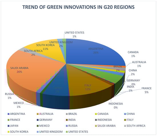 In addition, GRI, which consists of the development and implementation of technologies and practices that reduce environmental impact, is essential for achieving RCE. In the context of RCE, GRI can lead to significant reductions in resource use and waste, contributing to more sustainable production processes [67]. In 2022, the GRI in the G20 nations exhibited significant variation (as shown in Figure 5). Argentina and Saudi Arabia stand out for their particularly high percentages of green innovation (GRI), which may reflect targeted national strategies. Saudi Arabia’s high GRI aligns with Vision 2030, which prioritizes investment in renewable energy and environmental technology to diversify its oil-dependent economy [68]. Similarly, Argentina has shown increased commitment to sustainable innovation through policies promoting clean technology and renewable energy sectors [69]. In contrast, Indonesia and Germany display relatively lower GRI values. Indonesia’s performance may be constrained by limited institutional capacity, low R&D expenditure, and reliance on fossil fuels [70]. Although Germany is globally recognized for its environmental leadership, its innovation efforts may focus more on incremental improvements or cross-border partnerships, which may not be fully captured by domestic patent-based indicators [71]. These differences underscore the role of national policy orientation, institutional frameworks, and innovation measurement methods in shaping GRI across G20 economies.