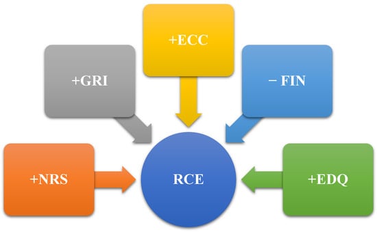With their advanced technological capabilities, G20 economies are well-positioned to lead in the development and adoption of GRI, thereby increasing their RCE [48,49]. Moreover, ECC, which reflects the diversity and sophistication of a country’s economic activities, is closely linked to RCE. The Economic Complexity Theory clarifies that more complex economies are better able to innovate and optimize resource use, leading to higher levels of efficiency [50,51]. In G20 economies, increased ECC can drive RCE by promoting the development of advanced technologies and industries that are less resource-intensive. This, in turn, contributes to sustainable economic growth and environmental sustainability. The integration of EDQ, NRS, FIN, GRI, and ECC provides a comprehensive framework for understanding and enhancing RCE in G20 economies. These factors are interconnected, and their combined effects can either enhance or hinder RCE depending on how they are managed.