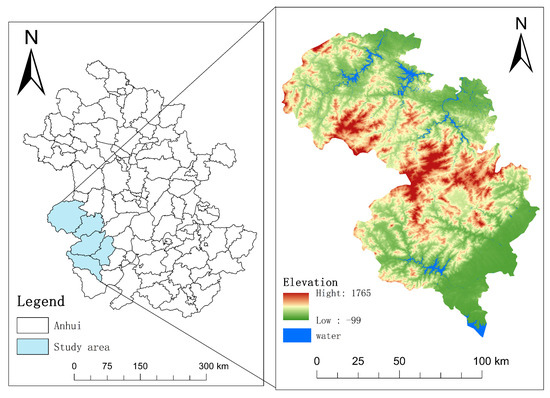 The Dabie Mountain Area is situated in the confluence of Hubei, Henan, and Anhui, serving as the watershed between the Yangtze River and the Huaihe River, and is recognized as one of the 25 significant ecological regions in China [33]. The Anhui Dabie Mountain region is situated in the western section of Anhui Province, with geographic coordinates ranging from approximately 115°22′ to 116°46′ E and 30°9′ to 31°48′ N and a total area of around 12,085 km2. It is situated in the transition zone between subtropical monsoon climate and temperate monsoon climate, characterized by four distinct seasons, a warm climate, ample rainfall, an average annual temperature ranging from 14 to 16 °C, and an annual precipitation of between 1000 to 1500 mm. The second national remote sensing survey on soil erosion indicates that ecological issues, including water and soil erosion, are more pronounced in this region, which is characterized as ecologically vulnerable [34]. The study area includes Jinzhai County, Huoshan County, Yuexi County, Taihu County, and Qianshan City within the Anhui Dabie Mountain region (Figure 1).